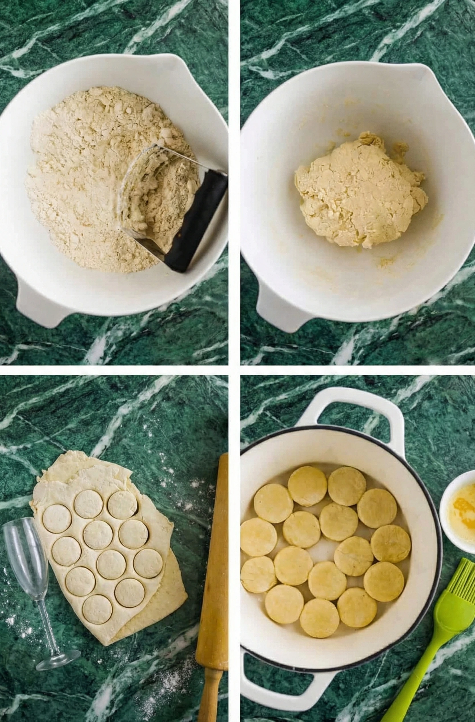 6. Cut and Bake Pat the dough into a disk about ½-inch thick. Using a round cutter (or the rim of a glass), press straight down—do not twist! Twisting seals the edges and prevents the biscuit from rising.
