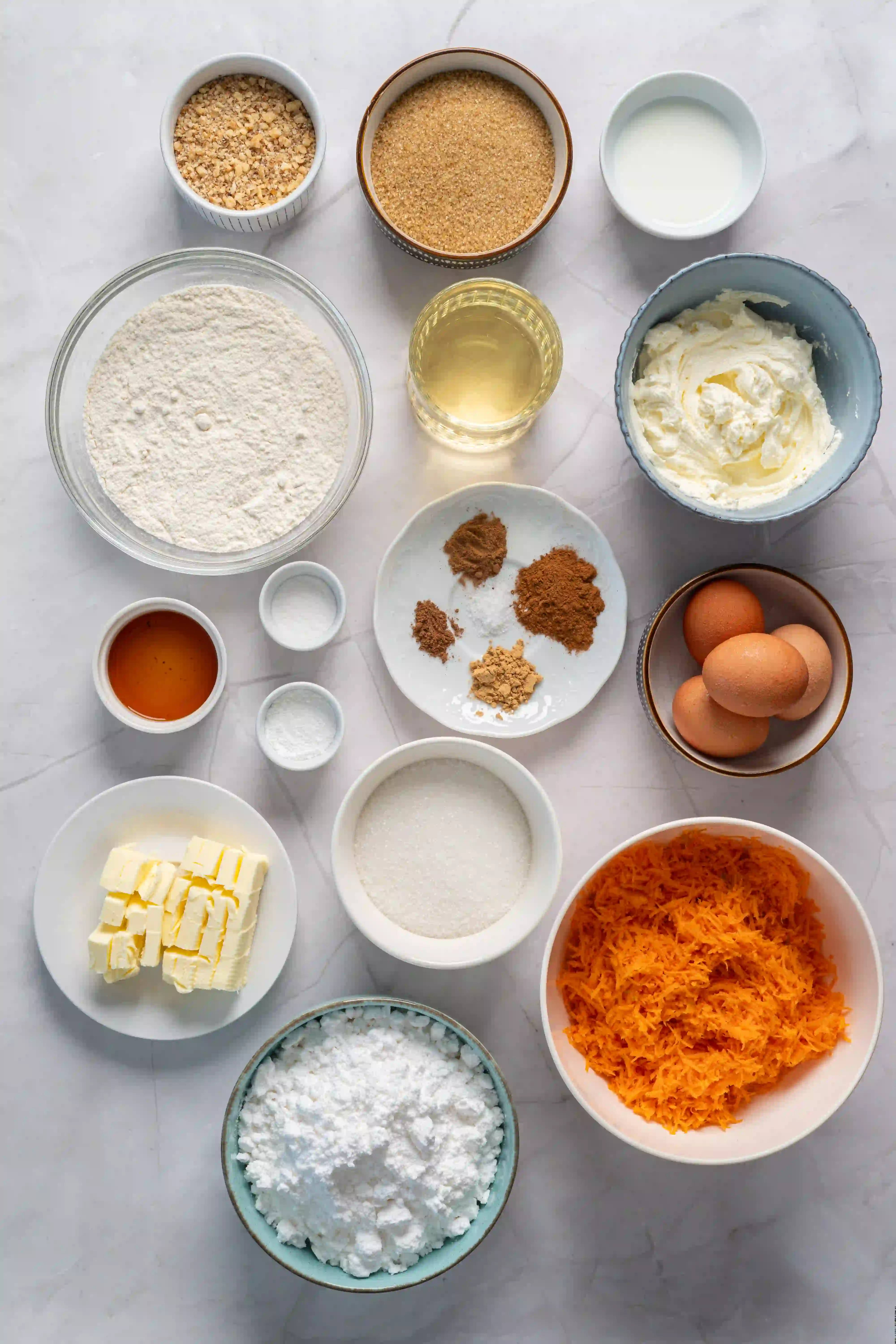 To create my delicious carrot cake, you’ll need the following key ingredients that combine to deliver a moist and flavorful dessert. This recipe is simple and quick, with only 20 minutes of prep time. Let’s get started!
