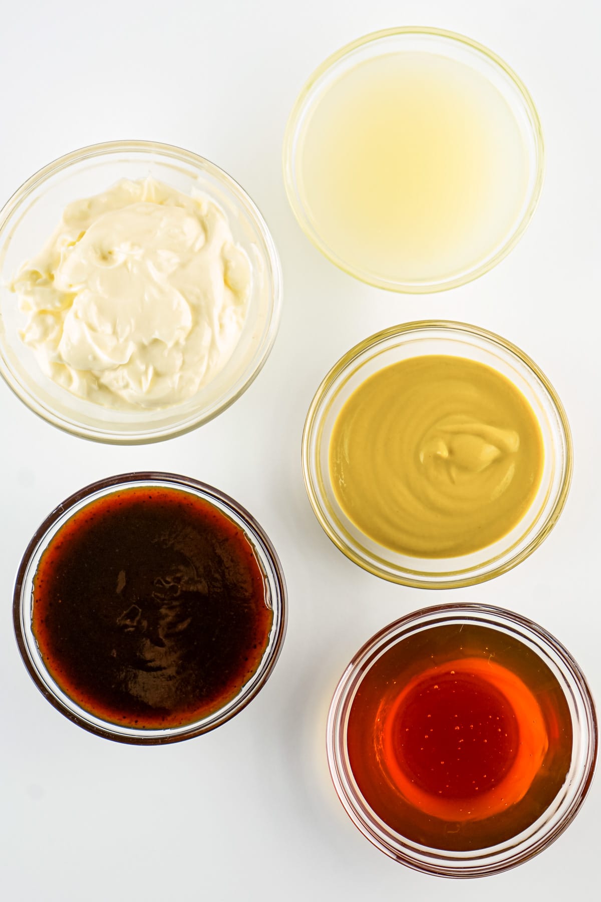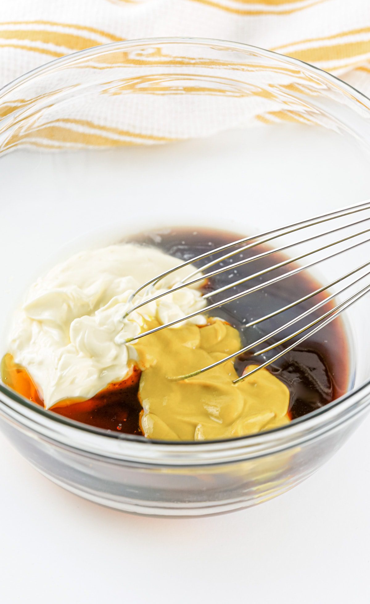 - Mix mayonnaise, yellow mustard, honey, and barbecue sauce in a bowl.