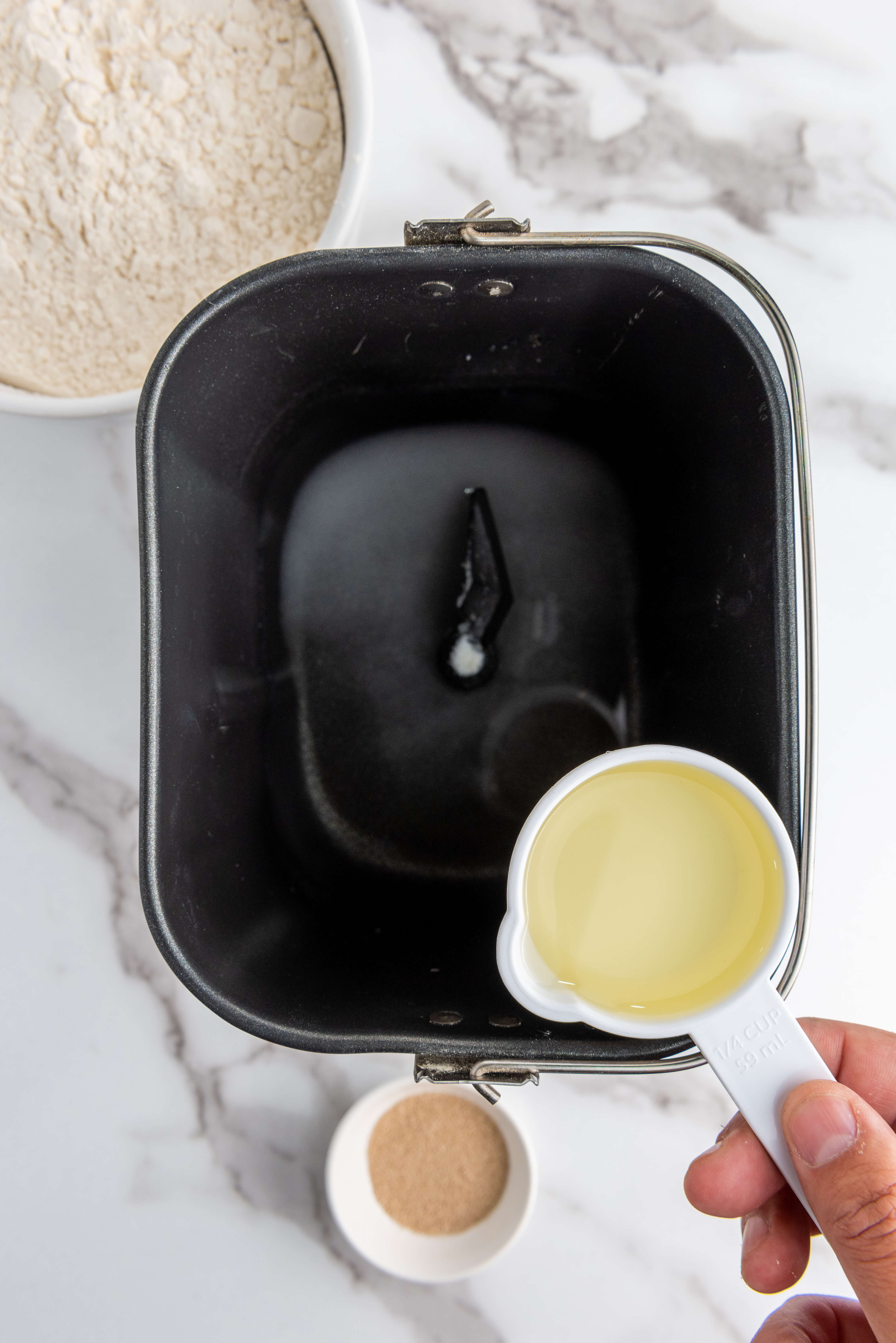 - Add all ingredients to the bread machine in the following order mentioned in the ingredients list.