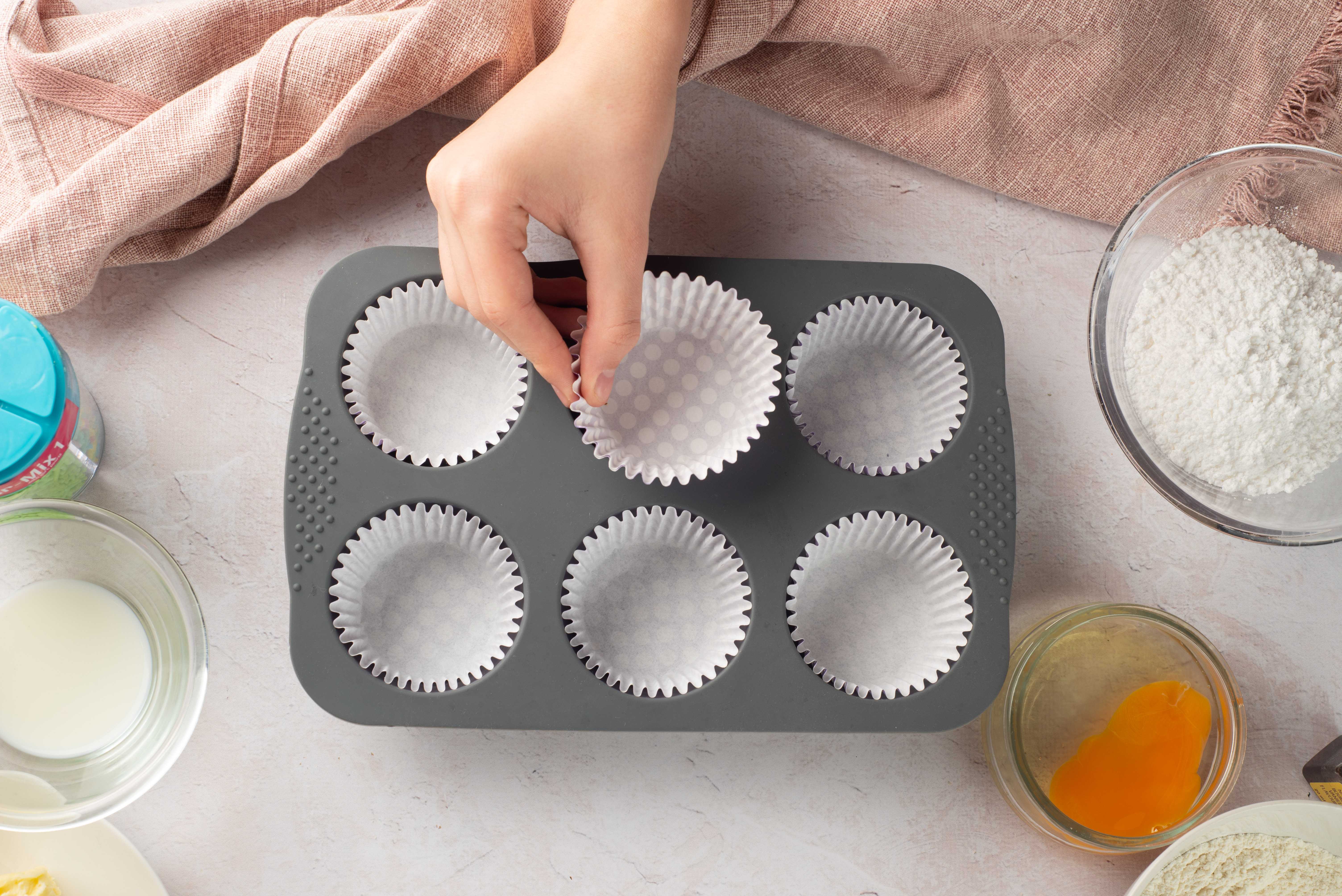 - Preheat the oven to 180°C and line a muffin tin with cupcake cases.