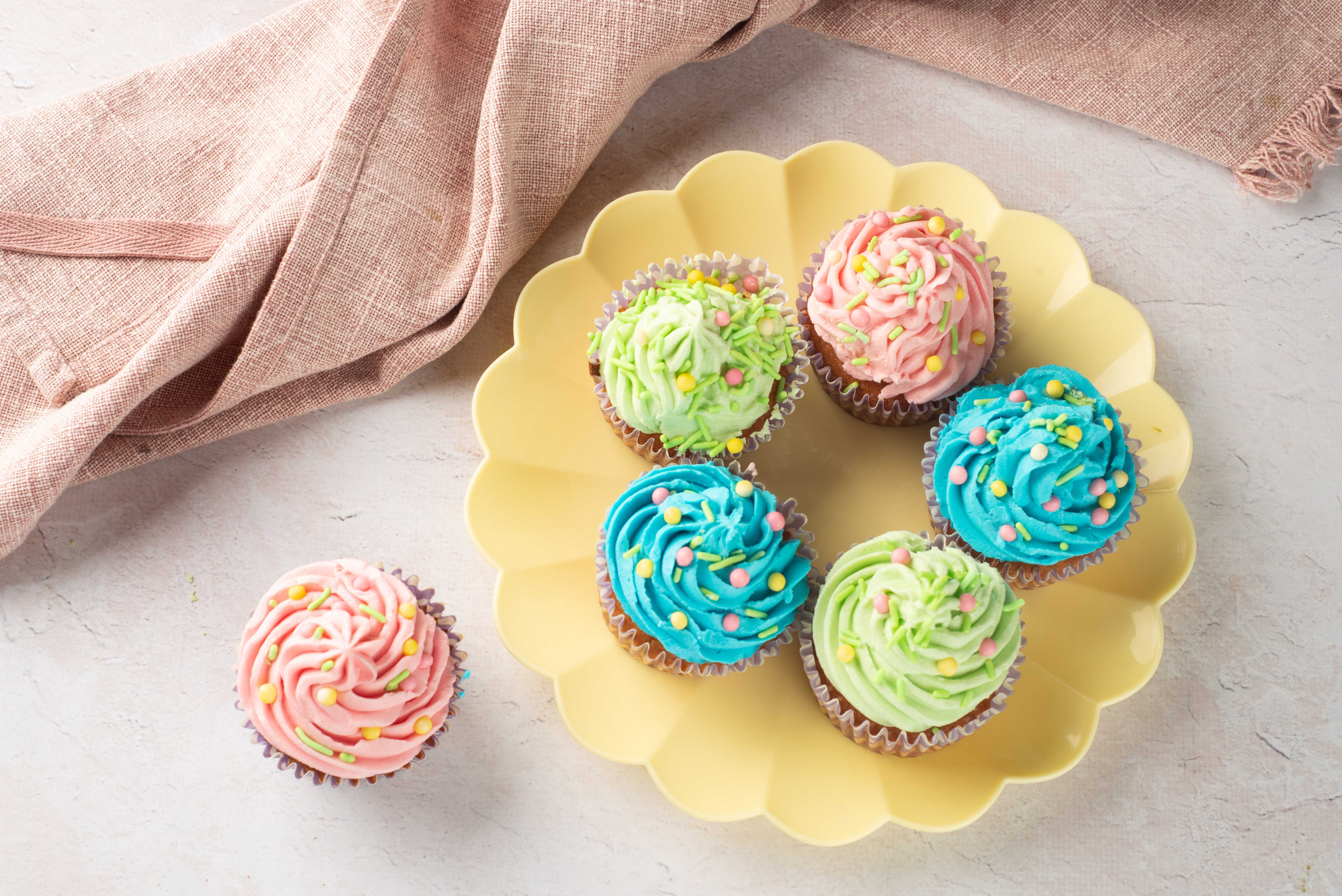 - Once the cupcakes are cooled, pipe the colored icing onto each cupcake in a swirl pattern. Finish by sprinkling with your favorite sprinkles.