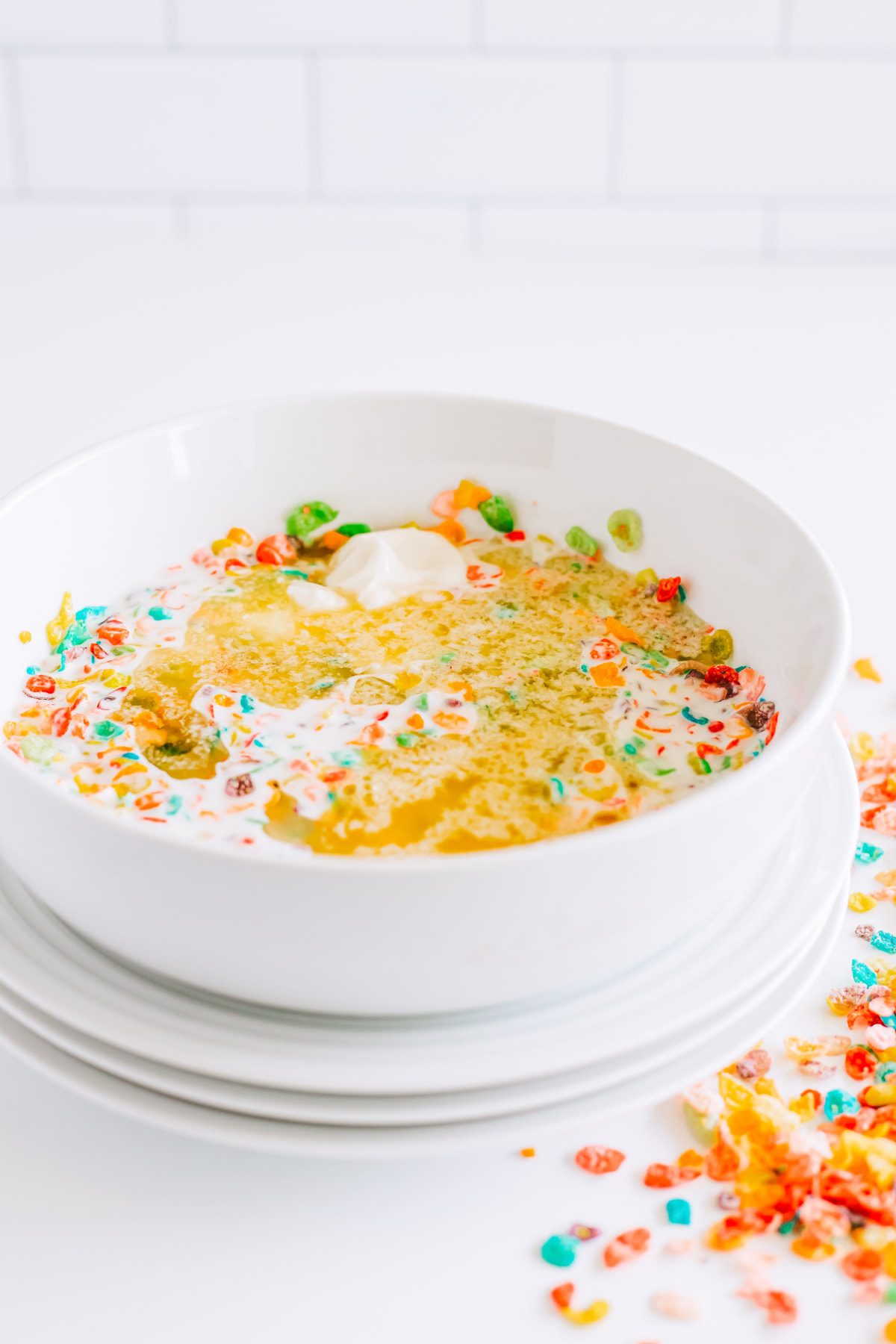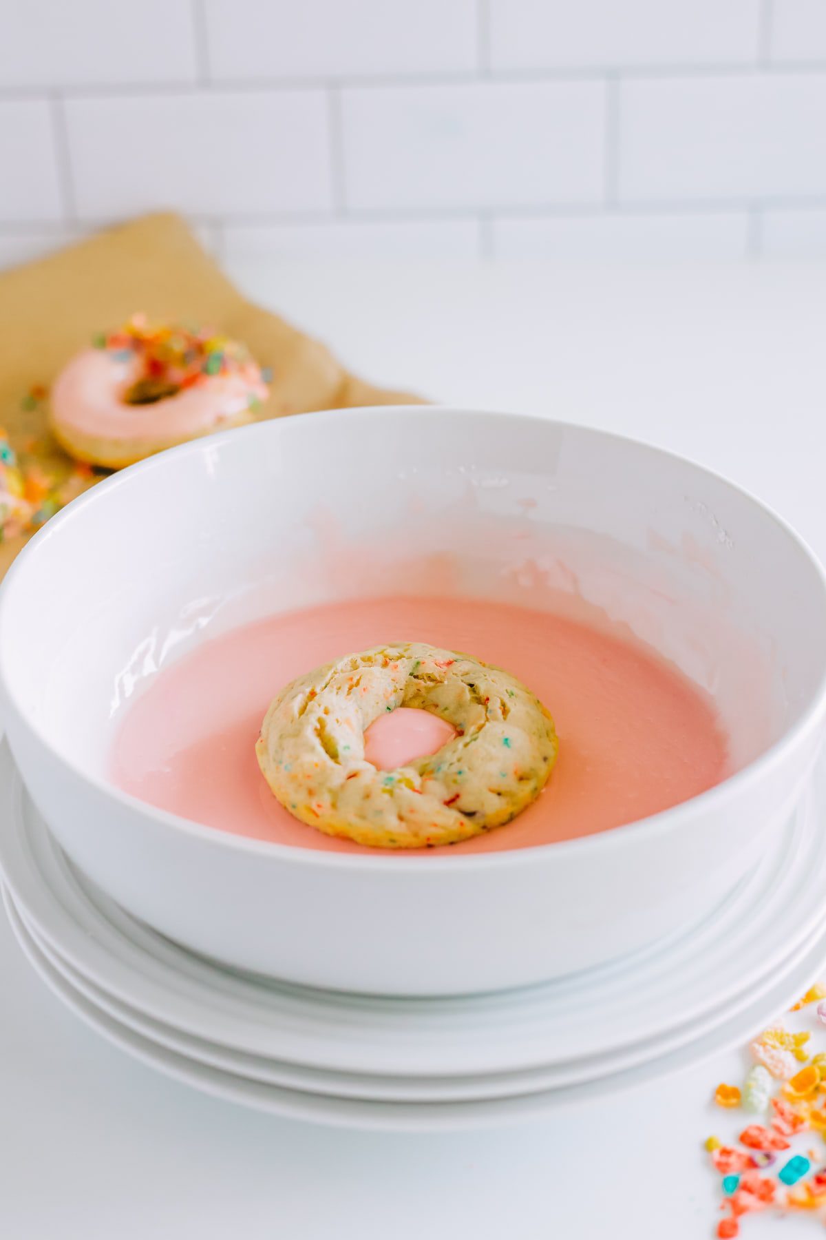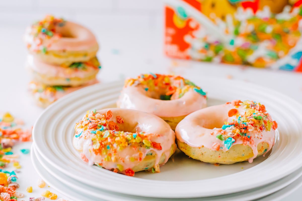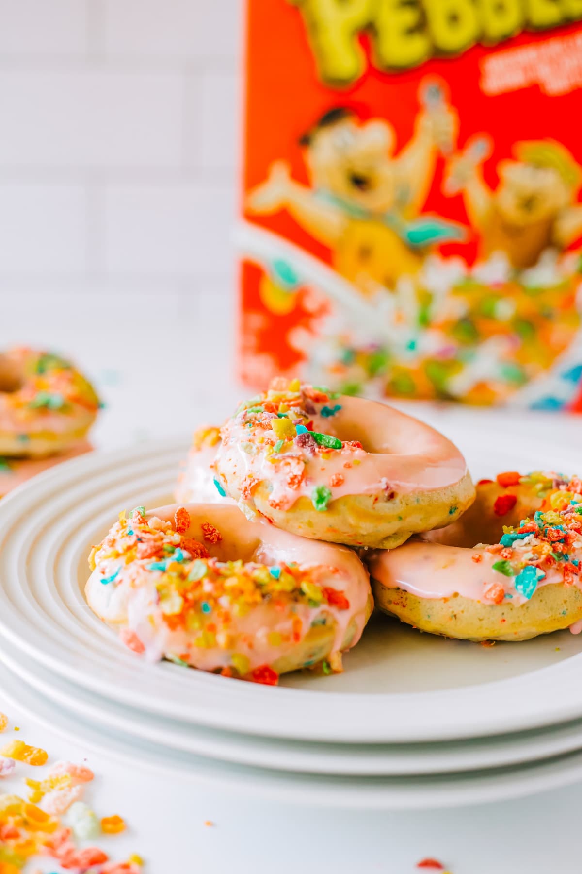 - Let the glaze set for a few minutes before serving. Enjoy the irresistible combination of the soft and fluffy donut with the crunchy Fruity Pebbles topping.