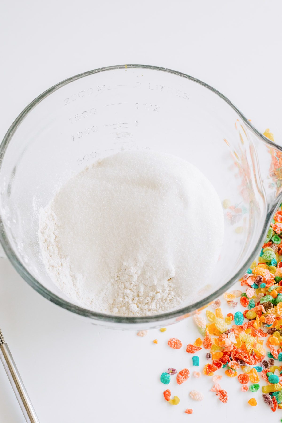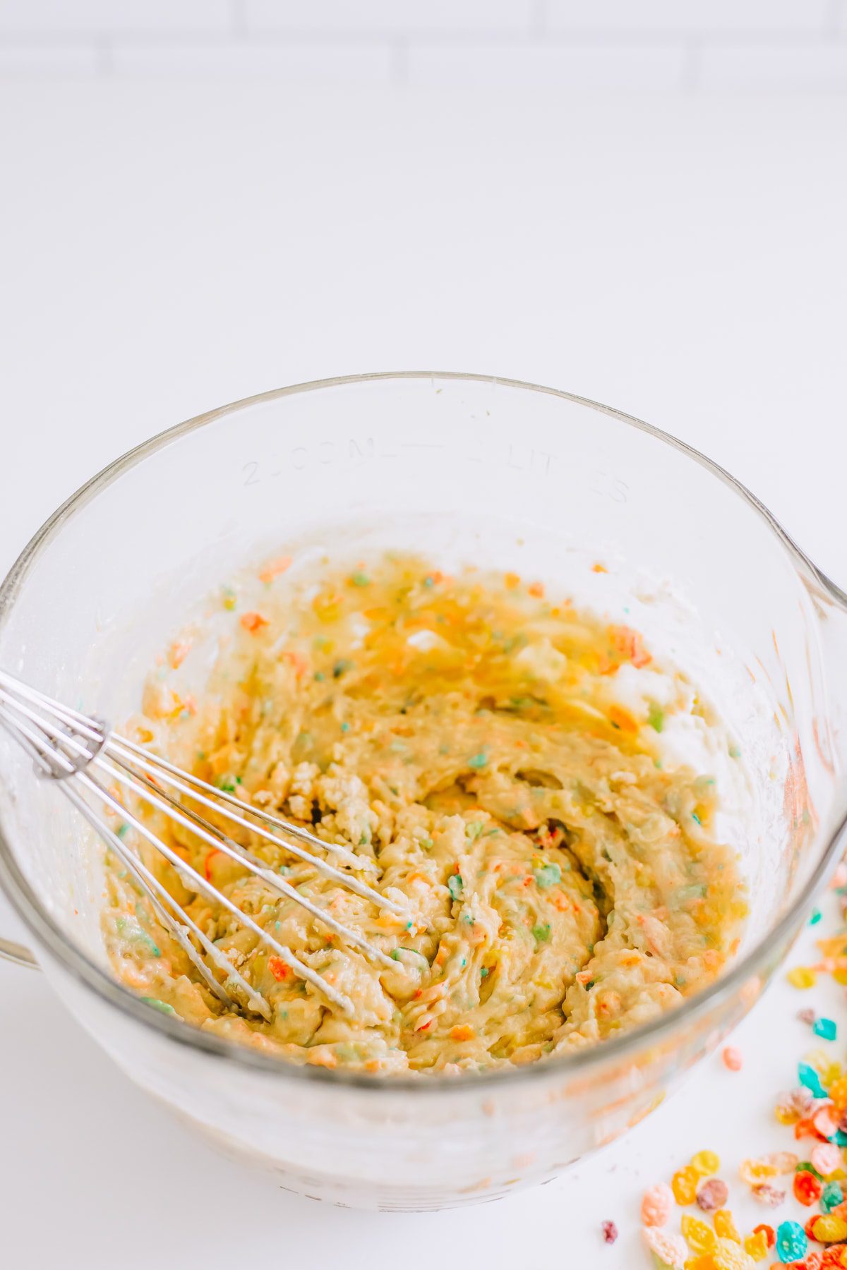 - Start by making the donut batter following the base Fruity Pebbles donut recipe I shared earlier.