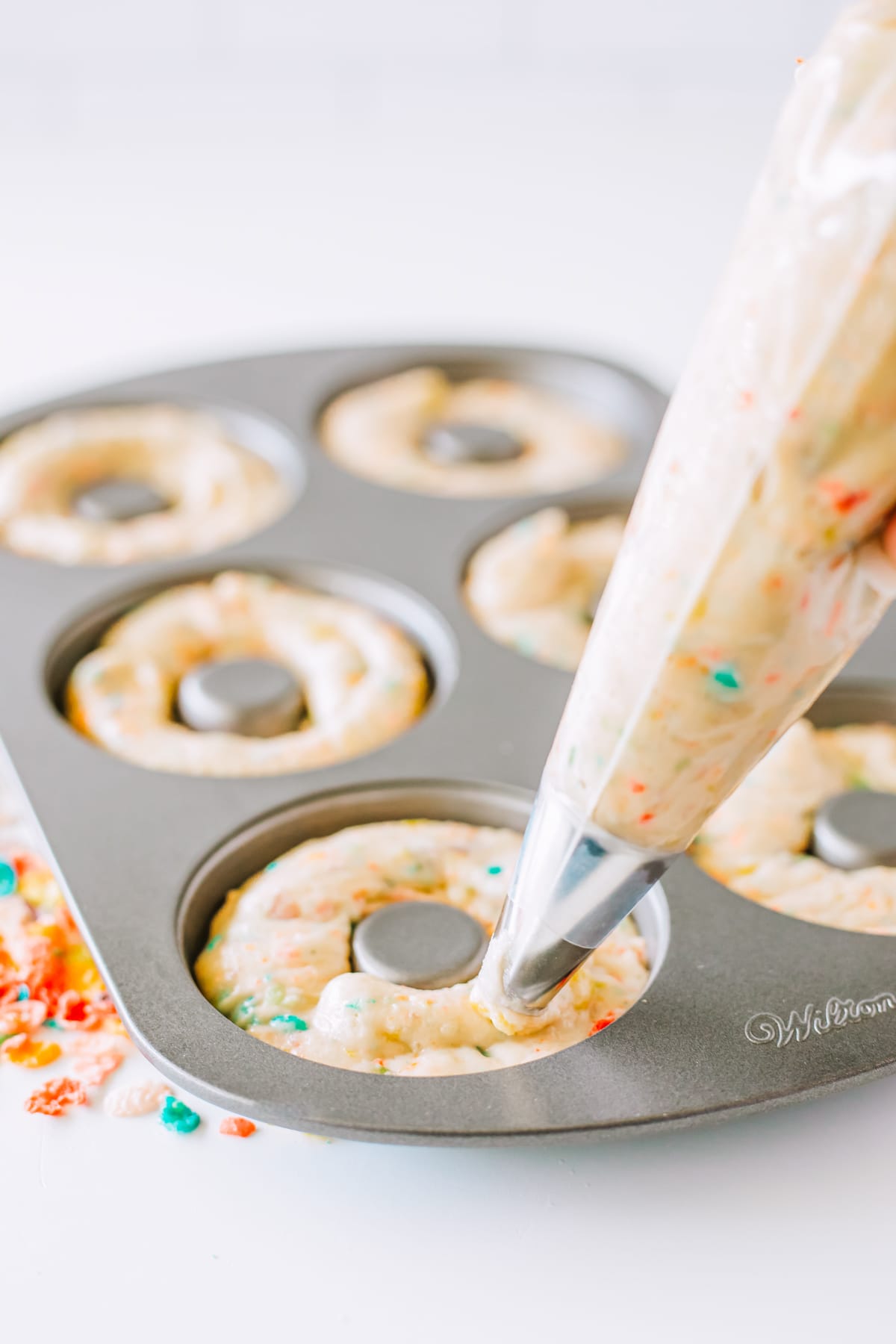 - Prepare the Fruity Pebbles donut batter as per the base recipe mentioned earlier.
