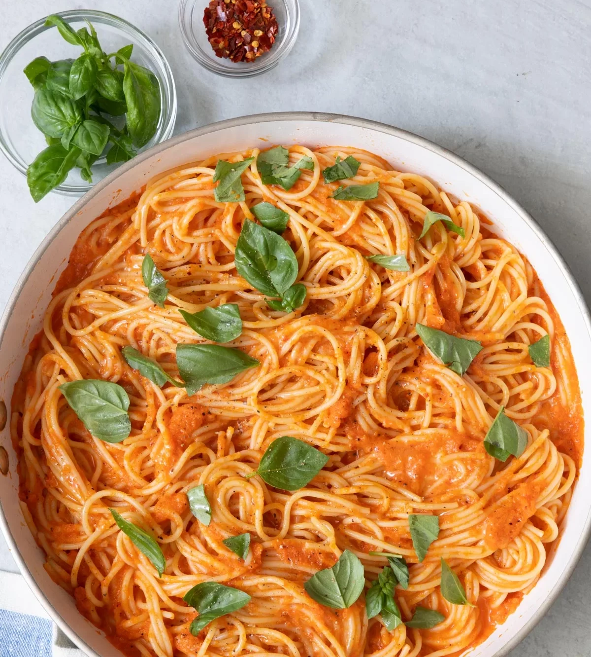 The infusion of roasted red peppers into a creamy base results in a smoky and vibrant green sauce in roasted red pepper sauce. This sauce option adds a bold and distinctive twist to pasta dishes, combining the smoky allure of roasted red peppers with the creamy textures of the sauce.