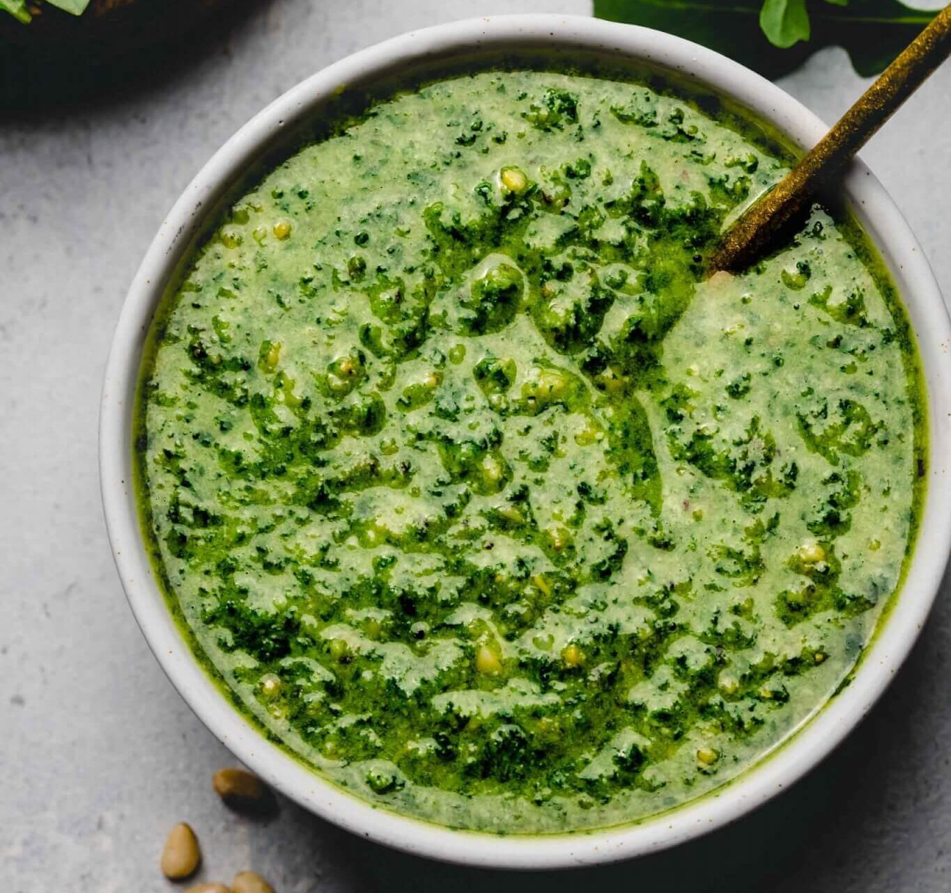 Arugula pesto sauce offers a peppery and vibrant twist to traditional pesto, infusing the creamy base with the distinct flavors of arugula and garlic. This versatile green sauce enhances pasta dishes, providing a captivating and zesty addition to the dining experience.
