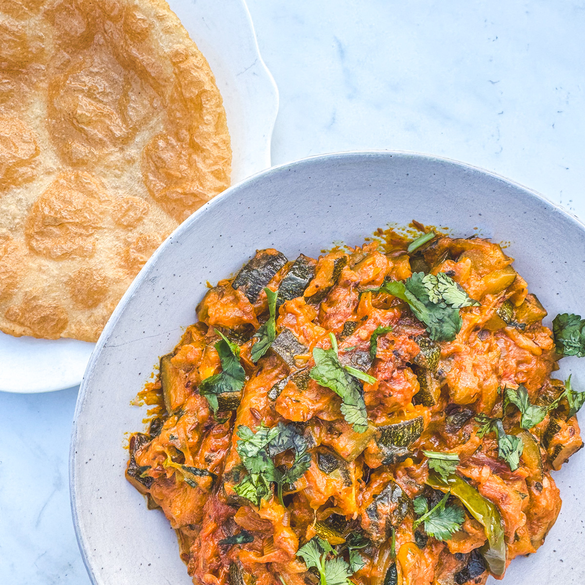 For those who prefer a richer texture, this variation uses yoghurt to create a luscious, tangy gravy. The zucchini softens in a base of onions, tomatoes, and kasoori methi (dried fenugreek), absorbing the sauce like a sponge.