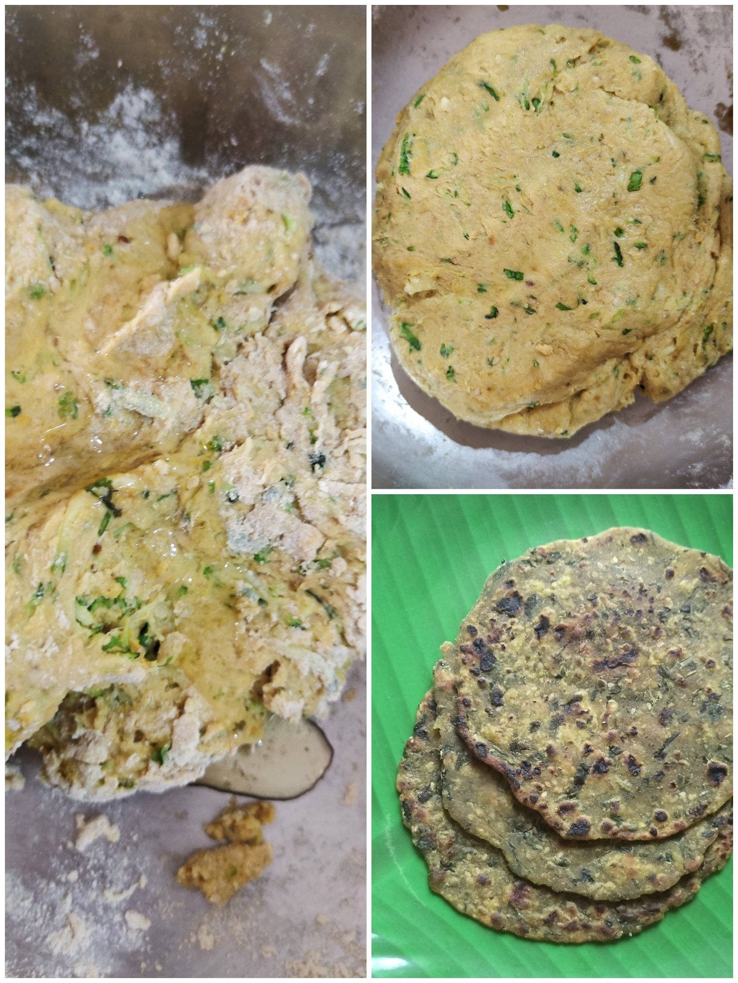 Parathas are unleavened flatbreads usually stuffed with potatoes or cauliflower. In this version, grated zucchini is kneaded directly into the whole wheat dough with cilantro and spices. The result is a soft, speckled flatbread that tastes delicious with pickles or curd.