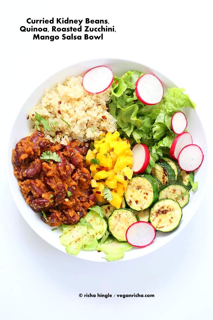 A fusion concept combining Indian flavors with modern bowl meals. Roasted zucchini is paired with curried kidney beans (rajma), quinoa, and a mango salsa for a meal that hits every flavor note: spicy, sweet, savory, and fresh.
