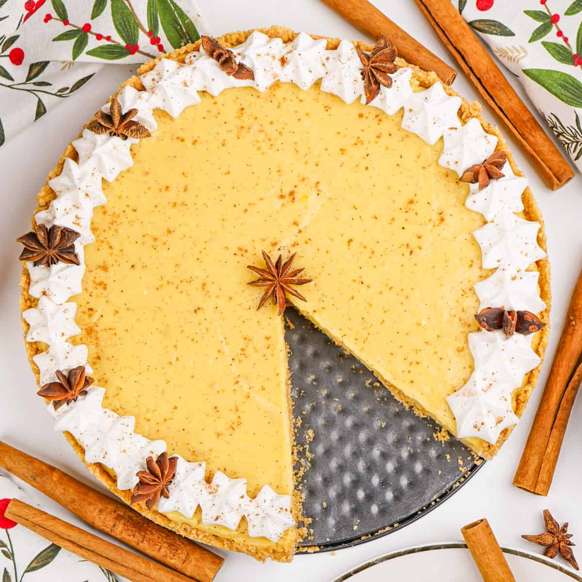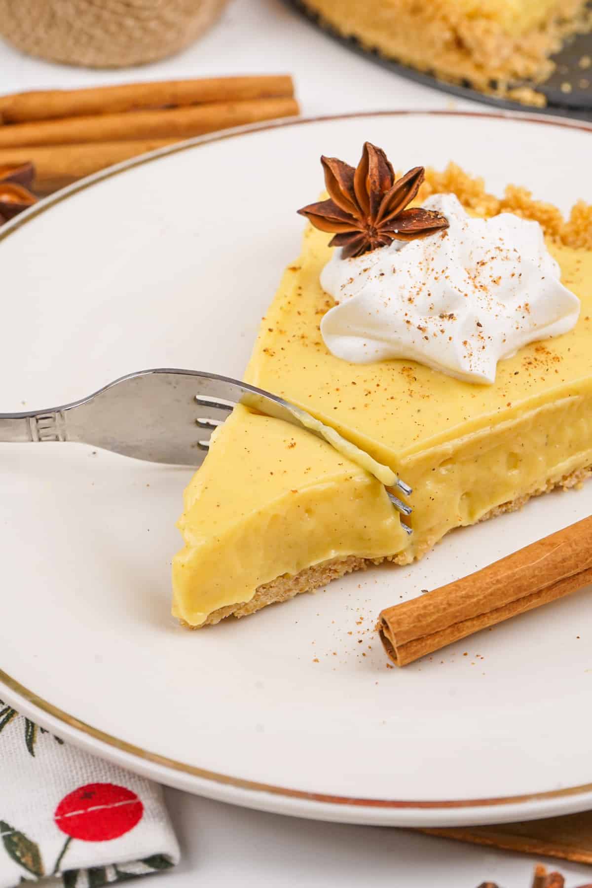 Once the pie has set, it’s time to add the finishing touches. Generously spread a layer of Cool Whip over the chilled pie. Sprinkle a bit of nutmeg on top to enhance the eggnog flavor. For a decorative touch, consider placing star anise on the pie’s surface. This not only adds visual appeal but also complements the festive flavors.