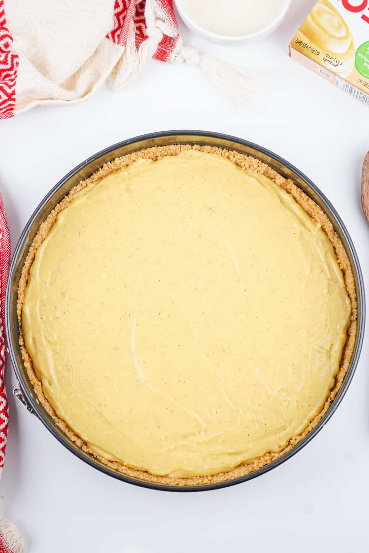 Once the filling achieves a thick and creamy consistency, carefully pour it over the prepared graham cracker crust in the springform pan. Use a spatula to spread the filling evenly, ensuring a uniform distribution. This step sets the stage for a well-balanced and decadent pie.