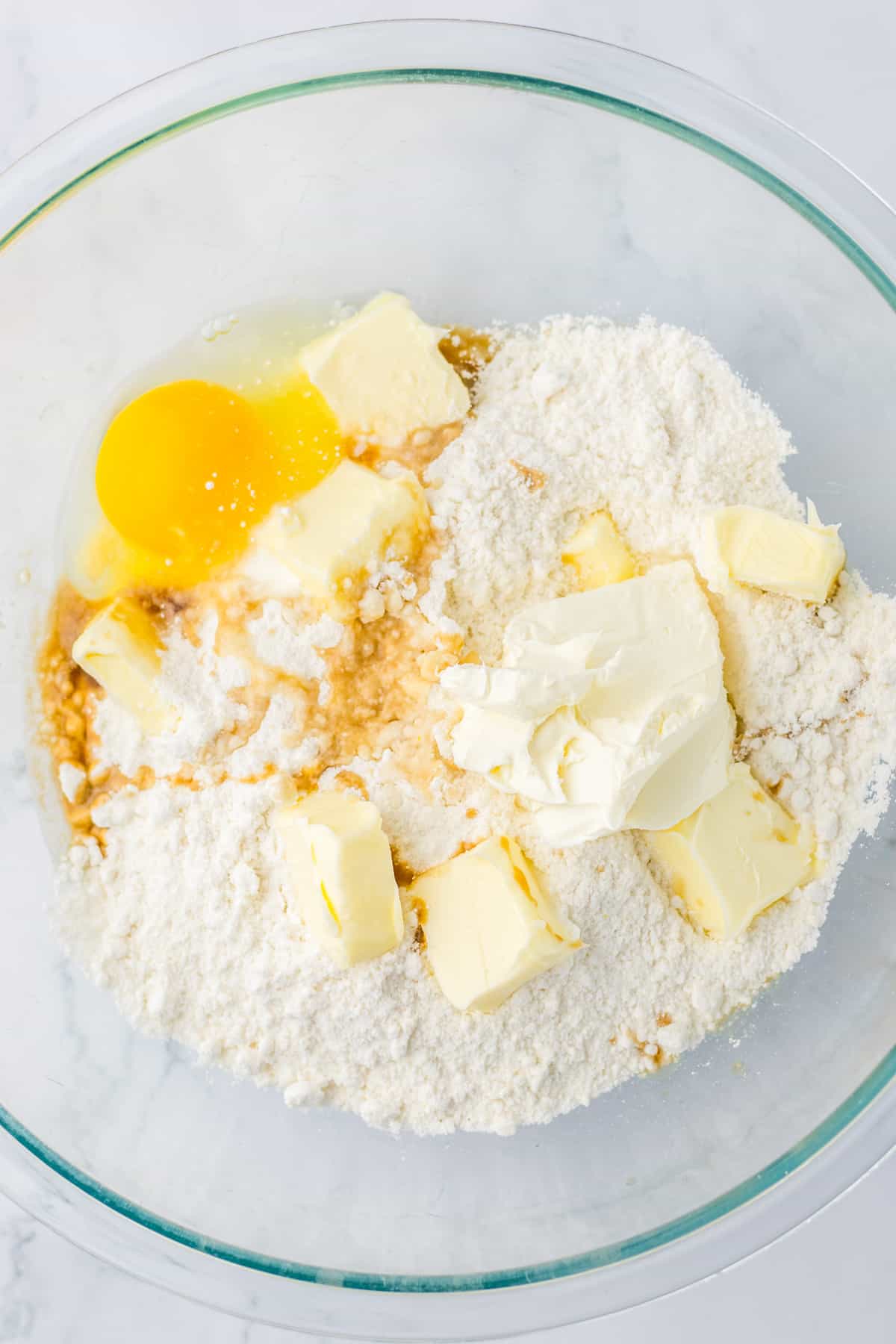 - Blend the cake mix, softened butter, egg, peppermint extract, vanilla extract, and softened cream cheese into a soft dough using a hand mixer.