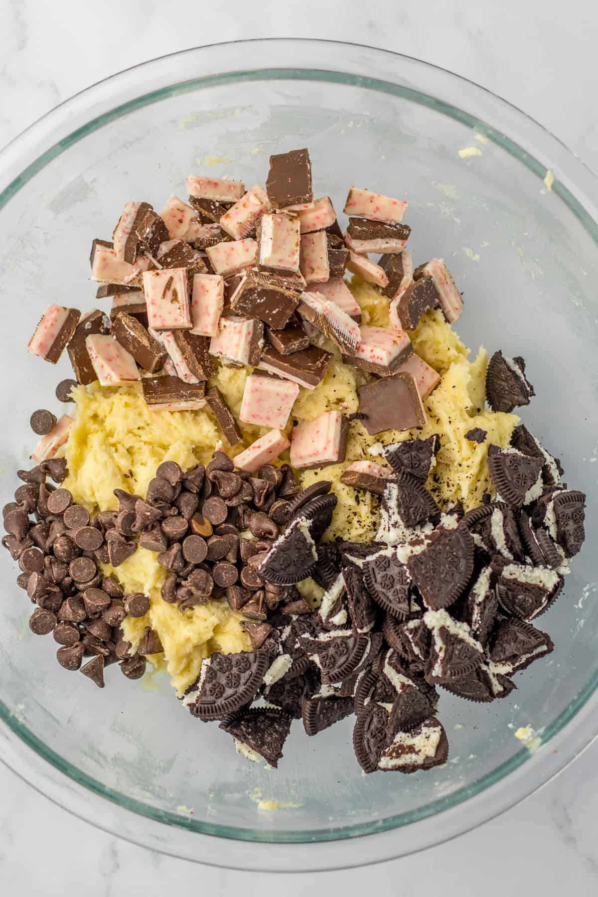 - Fold in Oreo chunks, chocolate peppermint pieces, and chocolate chips gently.