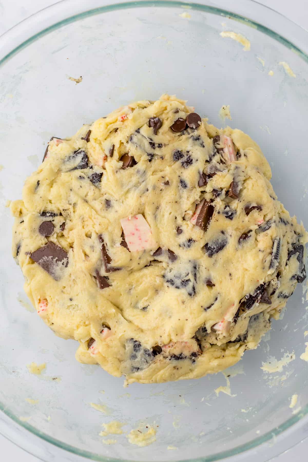 2. Gently fold in the Oreo cookie chunks, chocolate peppermint candy pieces, and semi-sweet chocolate chips using a spoon or spatula, making sure they are evenly distributed throughout the dough.