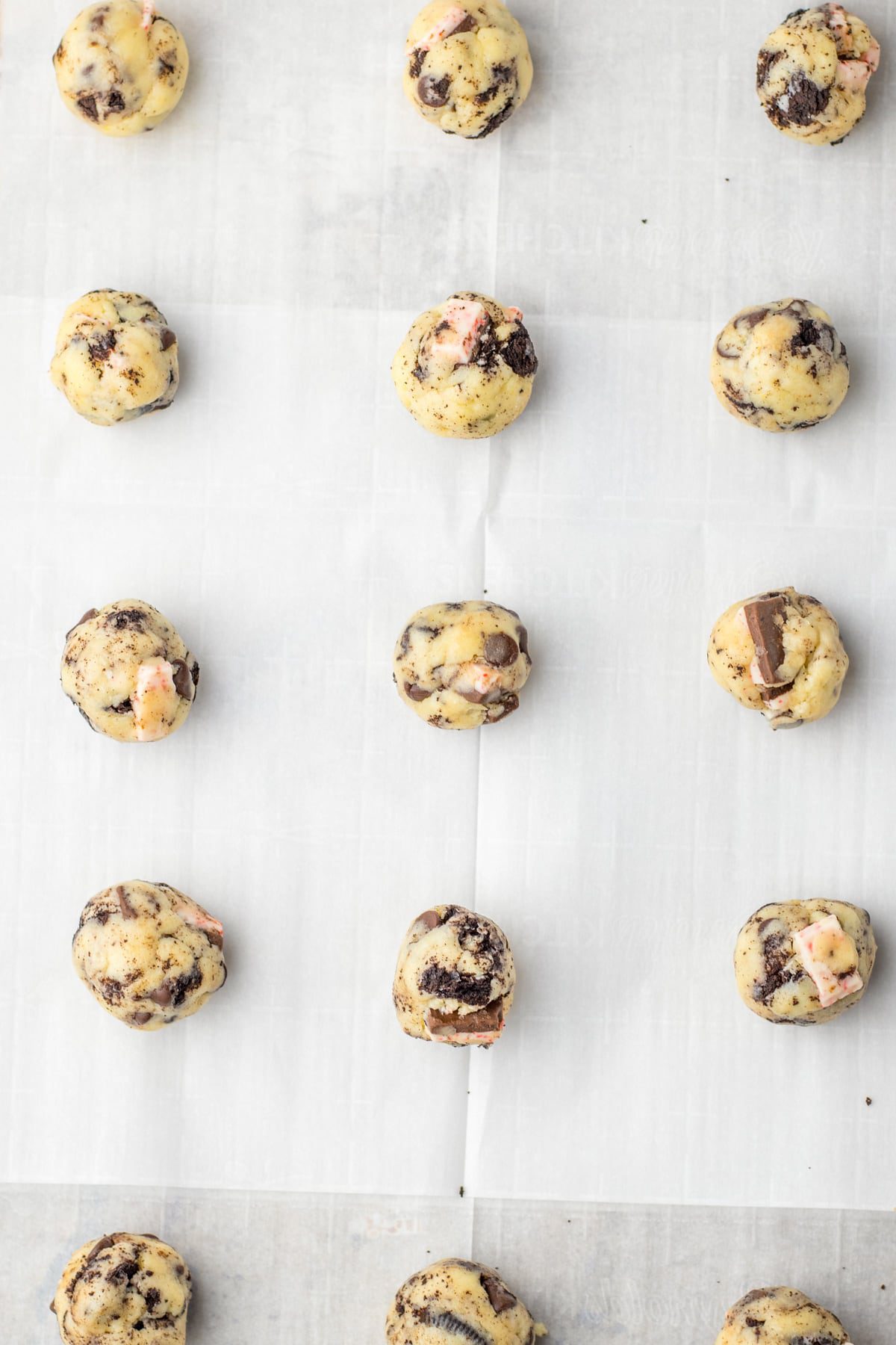 5. Remove the dough from the refrigerator and use a spoon to scoop out approximately 1 ½ tablespoons of dough for each cookie. Roll the dough into balls between your palms, then place them on the prepared baking sheet, ensuring there is enough space between each cookie to accommodate for spreading during baking.