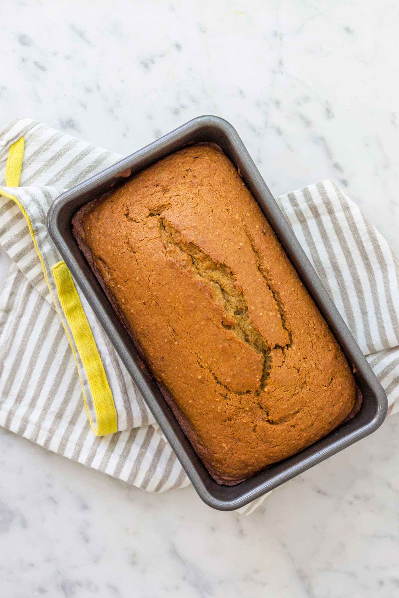 - Use a spatula to transfer the mixture to a greased loaf pan. Place in the oven and bake until a long toothpick inserted into the center of the loaf comes out clean, about 1 hour and 10 minutes.