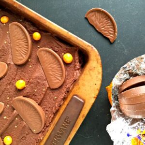 These bars are a perfect treat for any Terry’s Chocolate Orange fan! Not only is the base mixture a cross between a chocolatey cookie dough and fudge, but it’s spiked with orange liqueur and topped with loads of Terry’s Chocolate Orange segments. 😍