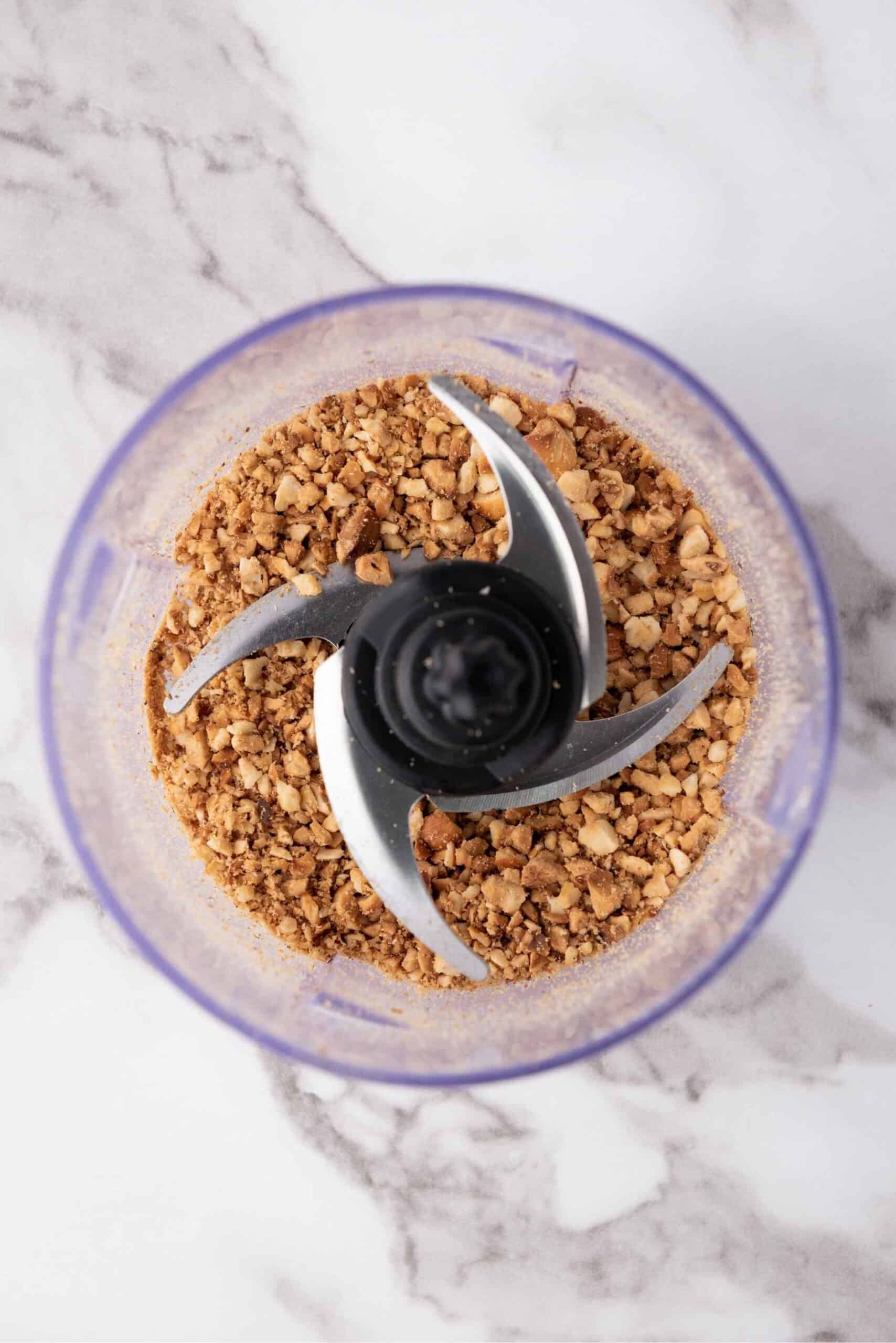 Toss your roasted, cooled nuts into a food processor. Pulse them until they are finely ground. You want a nice crumbly texture, not hazelnut butter!