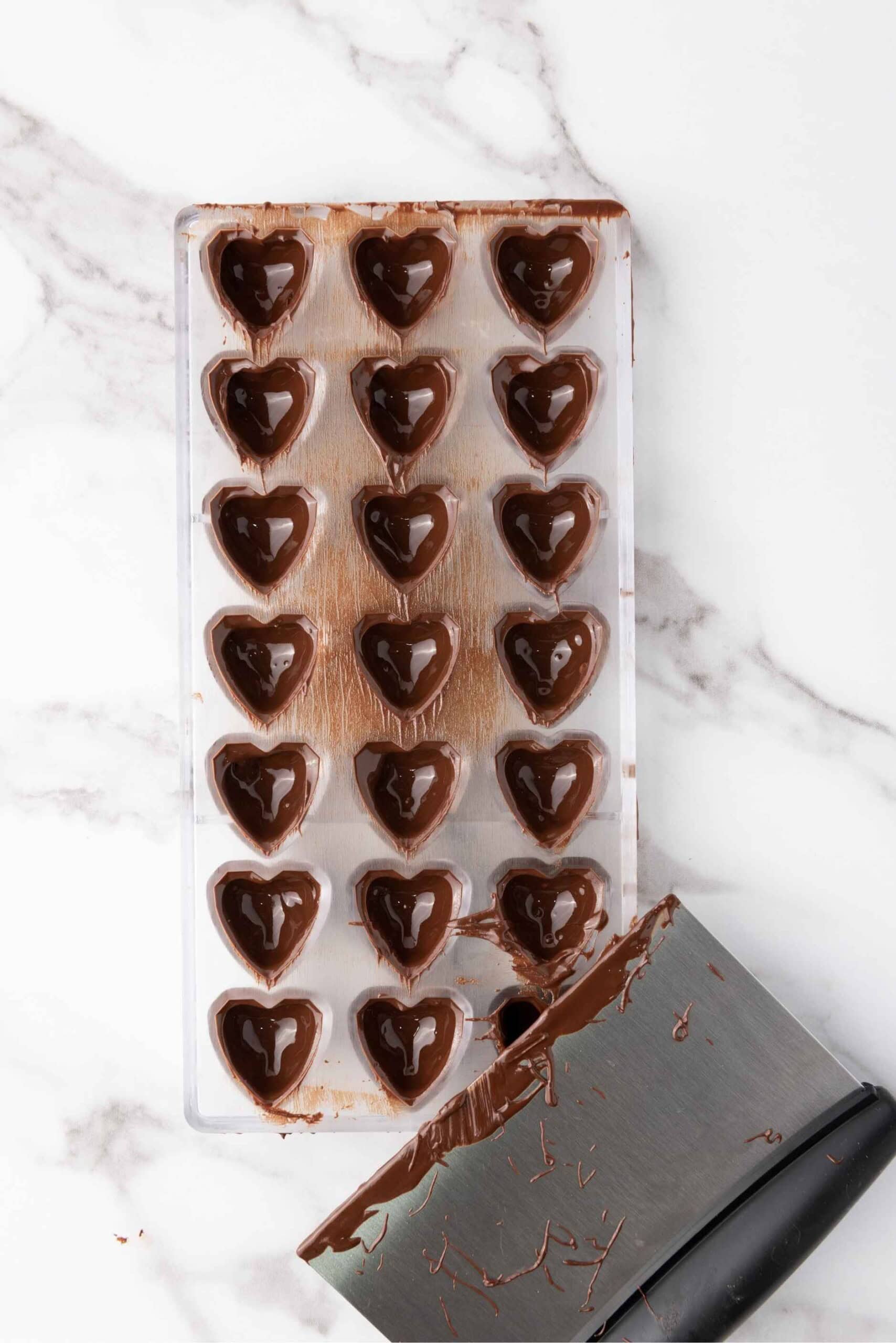 - Seal with Chocolate: Pour the rest of the melted chocolate over the filled molds to seal the hearts. Gently tap the mold on the counter to remove air bubbles and ensure the chocolate settles.