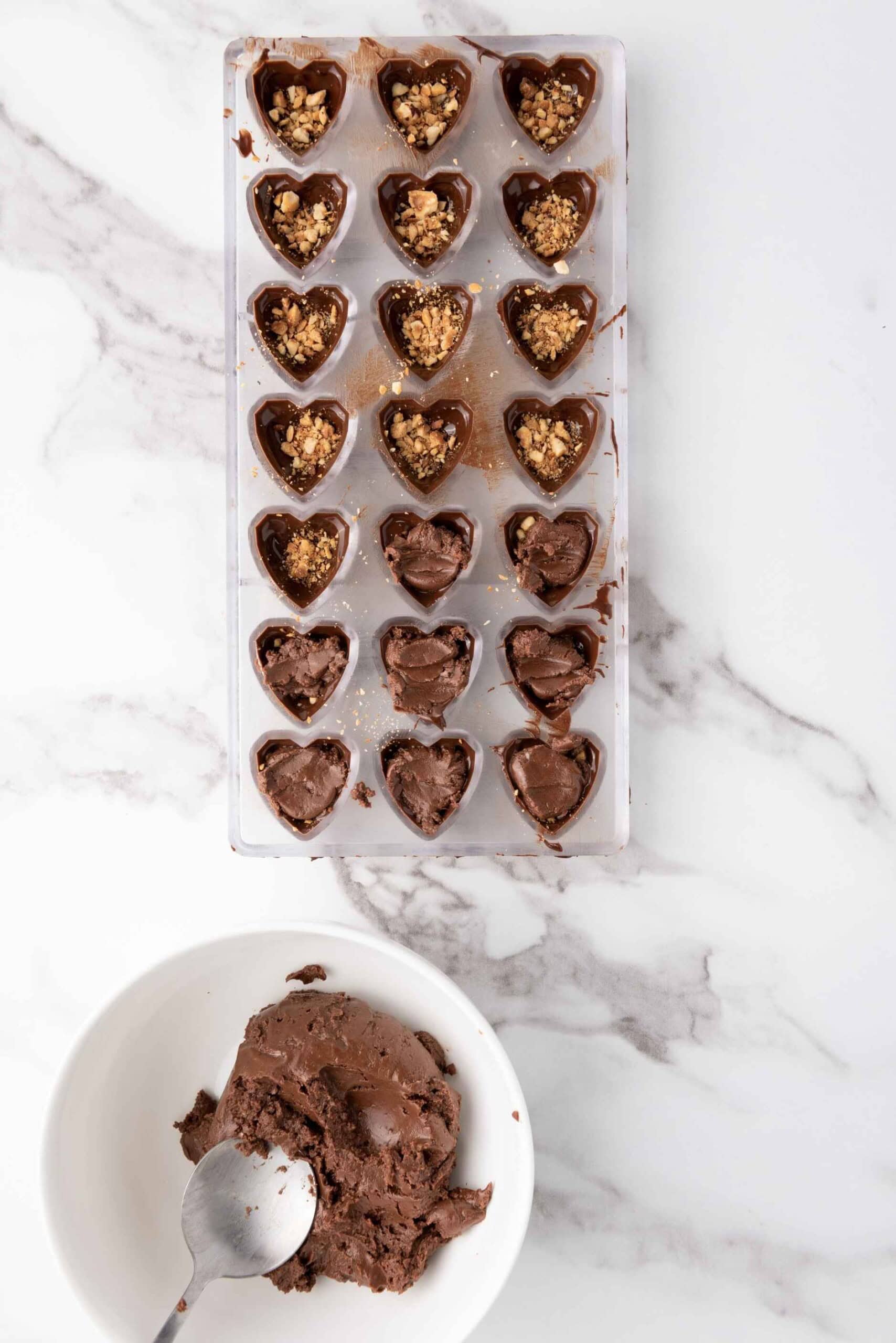 - Add Hazelnuts and Nutella Mixture: Sprinkle the ground hazelnuts into the chocolate shells. Next, fill each heart with the Nutella mixture, leaving a little space at the top for more chocolate.