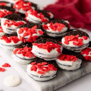 - Add Sprinkles: While the candy coating is still wet, generously sprinkle red heart sprinkles over the top of each Oreo to make them festive.